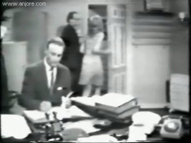 just pulled the door shut when Jeanne appears behind him and asks what he is doing. He tries to cover up, but he has been caught by surprise and is not convincing. Jeanne asks him why he is here, and tells him he doesn't look much like a bookkeeper. |